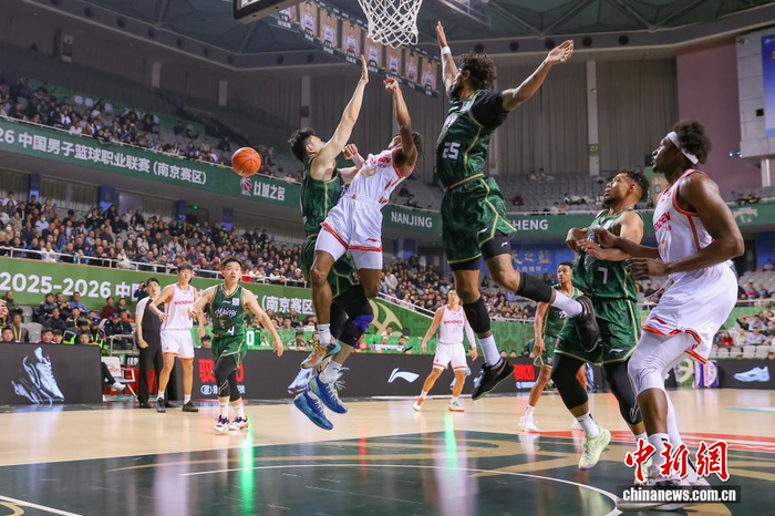 1月16日晚,在江苏南京举行的2025-2026赛季中国男子篮球职业联赛(CBA)常规赛比赛中,南京天之蓝队(绿衣)主场115比86战胜深圳马可波罗队(白衣)。图为南京天之蓝队球员所罗门(右三)在比赛中争抢。中新社记者 泱波 摄