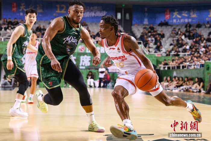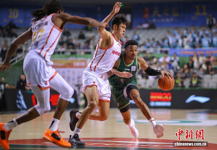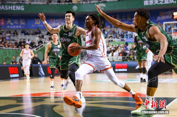 1月16日晚,在江苏南京举行的2025-2026赛季中国男子篮球职业联赛(CBA)常规赛比赛中,南京天之蓝队(绿衣)主场115比86战胜深圳马可波罗队(白衣)。图为南京天之蓝队球员汉兹(右)在比赛中进攻。中新社记者 泱波 摄