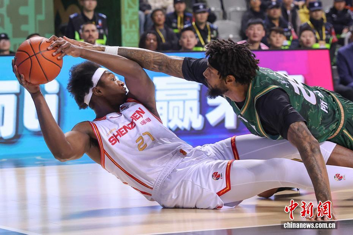 1月16日晚,在江苏南京举行的2025-2026赛季中国男子篮球职业联赛(CBA)常规赛比赛中,南京天之蓝队(绿衣)主场115比86战胜深圳马可波罗队(白衣)。图为深圳马可波罗队球员卡巴(左)在比赛中争抢。中新社记者 泱波 摄