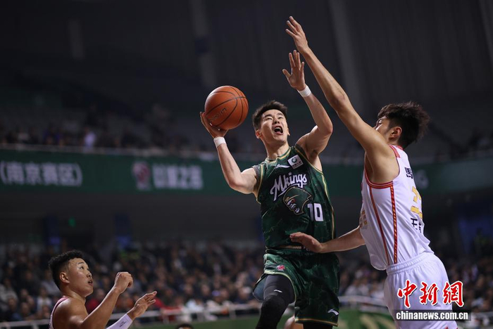 1月16日晚,在江苏南京举行的2025-2026赛季中国男子篮球职业联赛(CBA)常规赛比赛中,南京天之蓝队(绿衣)主场115比86战胜深圳马可波罗队(白衣)。图为南京天之蓝队球员郭昊文(右)在比赛中进攻。中新社记者 泱波 摄