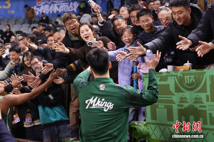 1月16日晚,在江苏南京举行的2025-2026赛季中国男子篮球职业联赛(CBA)常规赛比赛中,南京天之蓝队(绿衣)主场115比86战胜深圳马可波罗队(白衣)。图为球迷与南京天之蓝队球员击掌,庆祝取得比赛胜利。中新社记者 泱波 摄