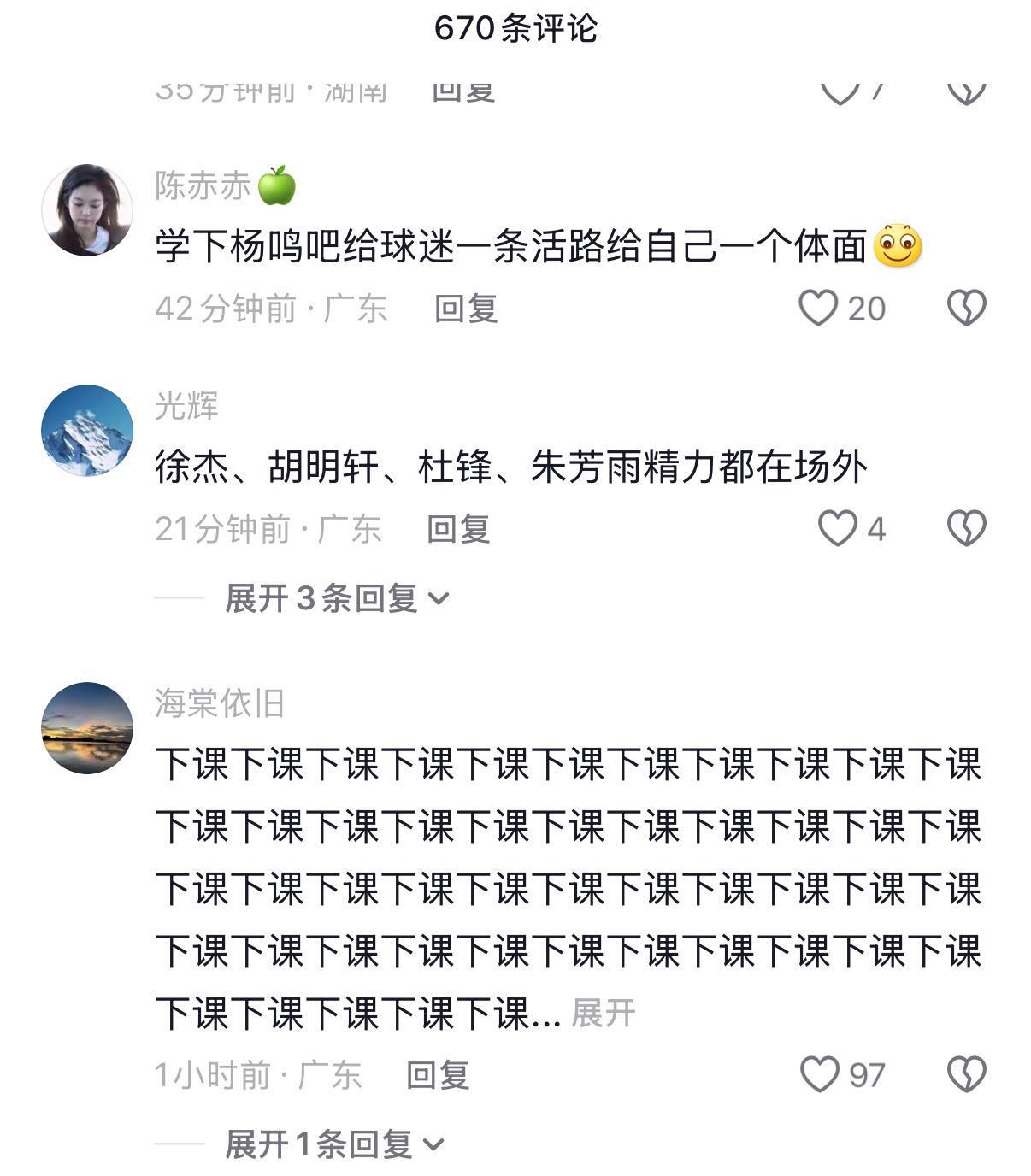 本场比赛杜锋再度让球迷感到绝望。赛前宏远官宣崔永熙复出,本赛季首次全员出战,结果上来球队就被打了一个26-11。杜锋在用人上、战术上、指挥上都彻底被辽篮的乌戈压制,加上历年来杜锋的各种离谱操作,广东球迷对杜锋的不满终于达到了顶点。赛后杜锋的社交媒体评论区一片“下课”呼声。有球迷建议杜锋和朱芳雨一起去找李春江钓鱼,有球迷建议杜锋学一下杨鸣,“给球迷一条活路,给自己一个体面”。也有球迷觉得杜锋最好是专心从政,球队还是交给合适的人接手好了。无论如何,杜锋的宏远教练生涯都到了最危险的地步,不知道陈老板还能忍他到什么时候。